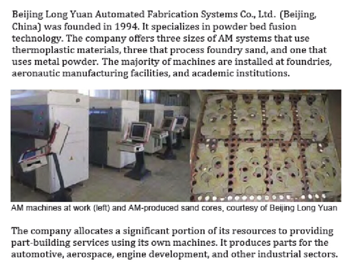 Dans la section consacrée aux entreprises asiatiques du rapport Wohlers 2015 récemment publié, un certain nombre d'entreprises représentatives en Chine, dont Beijing Longyuan Moulding, qui développent et vendent des produits d'impression 3D de qualité industrielle, sont mentionnées.