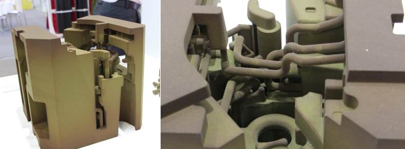 SLS砂鑄工藝,砂芯強度達4-6Mpa,精度0.1-0.2mm,適用于復雜管路、油路類產(chǎn)品。