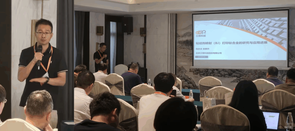 北京三帝科技股份有限公司作為會議支持單位應邀參會。公司董事長宗貴升博士擔任金屬材料增材制造關鍵制備技術分會主席。公司研發副總陳慶文在30日下午的論壇中作了題為《粘結劑噴射(BJ)打印鈦合金的研究與應用進展》的特邀報告。報告聚焦BJ技術高效率、低成本、無熱應力的核心優勢,深度解析了三帝科技在鈦合金成型領域的創新突破:
