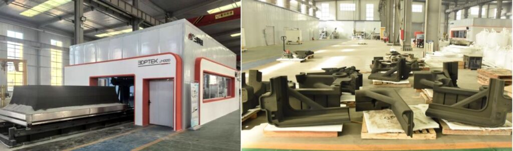 3DPTEK-J4000尤其適用于航空航天、船舶、電力能源、工程機械、汽車(新能源)等領域的大尺寸、批量化鑄件制造需求。在航空航天領域,可用于制造發動機零部件、航天器結構件、動力裝置等重要部件,有效解決超大尺寸、多維曲面、復雜結構工件的成型難題,在小批量大尺寸模具制造以及特種行業的模具迭代升級研發上有著傳統制造工藝無法比擬的優勢。在電力能源領域,可用于大尺寸耐壓復雜型腔結構件、大尺寸薄壁輕量化零部件等的制造。在汽車領域,可實現具有復雜螺旋形冷卻水道的大尺寸薄壁電機殼、輕量化車架、復雜內腔結構殼體缸體/缸蓋等產品的制造。